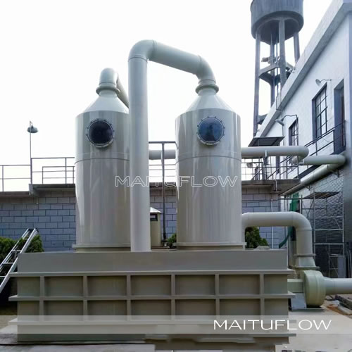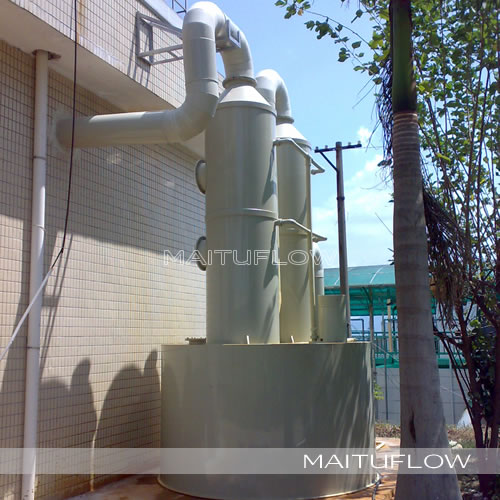 本裝置由單塔或串聯(lián)的雙塔組成,雙塔具有多級吸收功能,能確保將泄漏出來的氯氣及時吸收,并進(jìn)行無害化處理。當(dāng)有氯氣泄露時,由于氯氣比空氣的比重大,因而外泄的氯氣總是下沉。從氯瓶中跑出的液氯,流到地面或地溝后迅速氣化,安裝在氯庫的氯氣檢測報(bào)警儀檢測到微量氯氣后自動報(bào)警,啟動漏氯吸收保護(hù)裝置,其引風(fēng)機(jī)通過地面上的引風(fēng)管,把外泄的氯氣抽到反應(yīng)塔進(jìn)行處理。耐腐蝕泵將溶液箱中的溶液送到兩個反應(yīng)塔。在塔內(nèi),循環(huán)泵產(chǎn)生的高壓反應(yīng)液由噴嘴產(chǎn)生霧化,氣體從第一個吸收塔由下向上開始升流,與塔頂噴灑下的吸收液在填料中相互接觸。一部分氣被吸收,其余的通過中間管進(jìn)入第二吸收塔,再進(jìn)行第二次吸收。