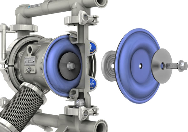 在衛(wèi)生領(lǐng)域應(yīng)用中,被泵送的介質(zhì)通常都含有懸浮的小顆粒。在這種情況下,許多用戶都會選用PTFE/EPDM一體式膜片,其接觸物料一側(cè)的材質(zhì)是聚四氟乙烯(PTFE),接觸壓縮空氣一側(cè)的材質(zhì)是三元乙丙橡膠(EPDM)。一體式膜片可阻止任何介質(zhì)滲入膜片壓板背面,從而不會滋生細菌。
