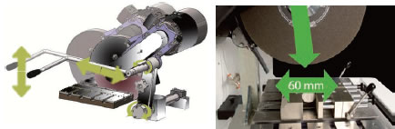 由于軌道式切割節(jié)約了功率,減少了切割輪的負(fù)載,所以可以通過更換350mm切割輪安裝擴展套裝, 使用更大Φ350mm的切割輪。用來切割Y軸行程較長的長條形試樣。 |